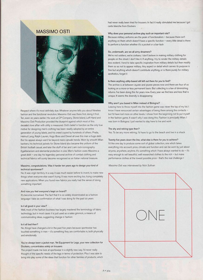 Несмотря на то, что к 91-му Массимо продал 100% акций C.P. Company и Stone Island, он оставался главным дизайнером (до 94-го). После ухода из C.P. брался за новые проекты, ведь поток сознания был ого-го: Left Hand (Ости был левшой), ST95, Homage to Alvar Aalto, Dockers Equipment for Legs, Levi's ICD/ICD+ в духе «Бегущего по лезвию» и многие другие. Эти бренды не выстрелили, как C.P., но это интересная веха в карьере дизайнера. В 99-м Arena Homme+ (журнал) назвал Массимо Ости «самым влиятельным человеком в мужской моде 90-х». Спорить с этим невозможно, даже пытаться не будем!