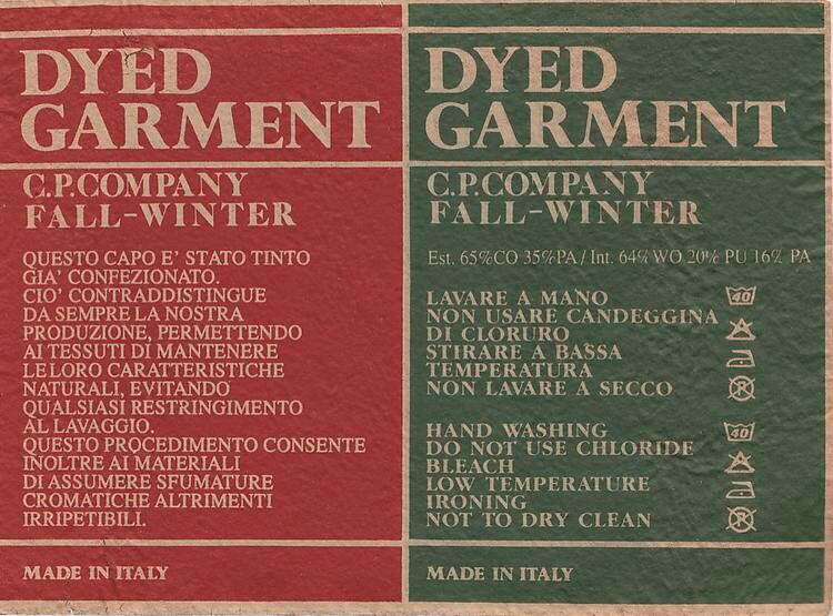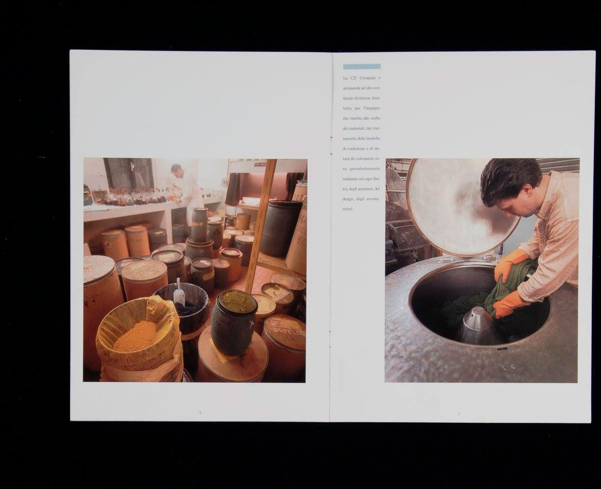 В 73-м будущий создатель C.P. Company со своими сотрудниками мощно нахимичили и открыли радикальную технику окрашивания garment dyed. Эта технология стала ключевым ноу-хау компании. Изделия окрашивались в готовом виде в специальной цветовой лаборатории, благодаря чему удавалось добиться винтажного окраса.